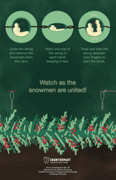 I designed this interactive holiday card for Counterpart Design using the classic thaumatrope animation technique. When spun, two illustrated snowmen appear to join hands inside a snow globe, adding a nostalgic and playful twist to a festive greeting.